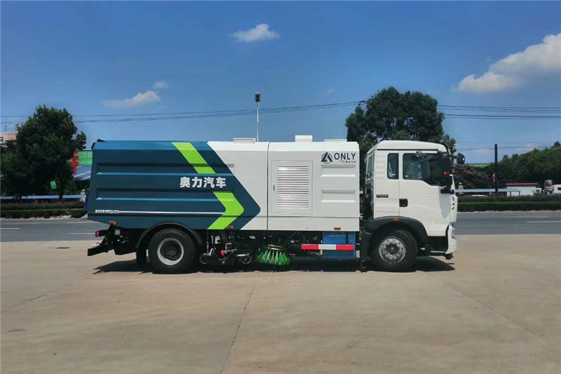 1)该车集扫路车、洒水车和高压清洗车功能于一体,具备路面清扫、路面洗刷、高压清洗、低压冲洗、路缘石洗刷、垃圾收集、污水回收、喷雾降尘和道路隔离墙清洗、小广告清洗等多种作业功能。